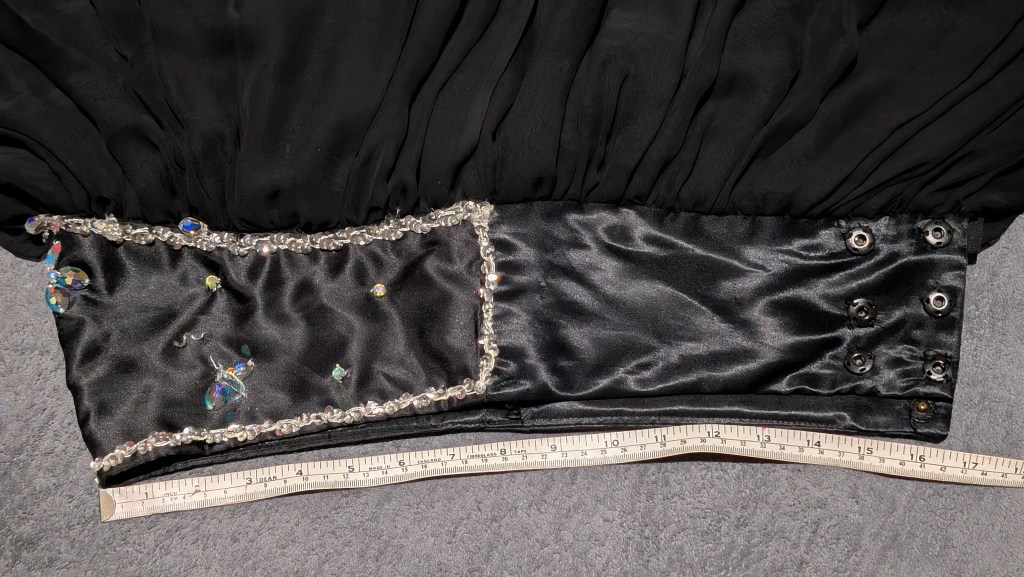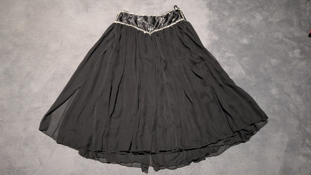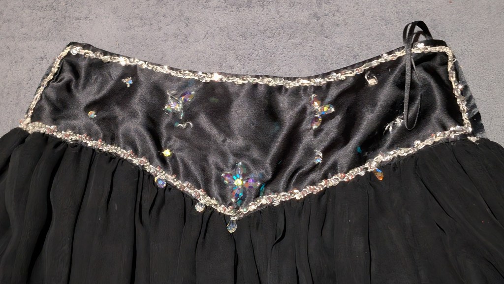Black chiffon skirt with satin belt area, satin finish bra with silver coins