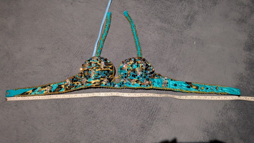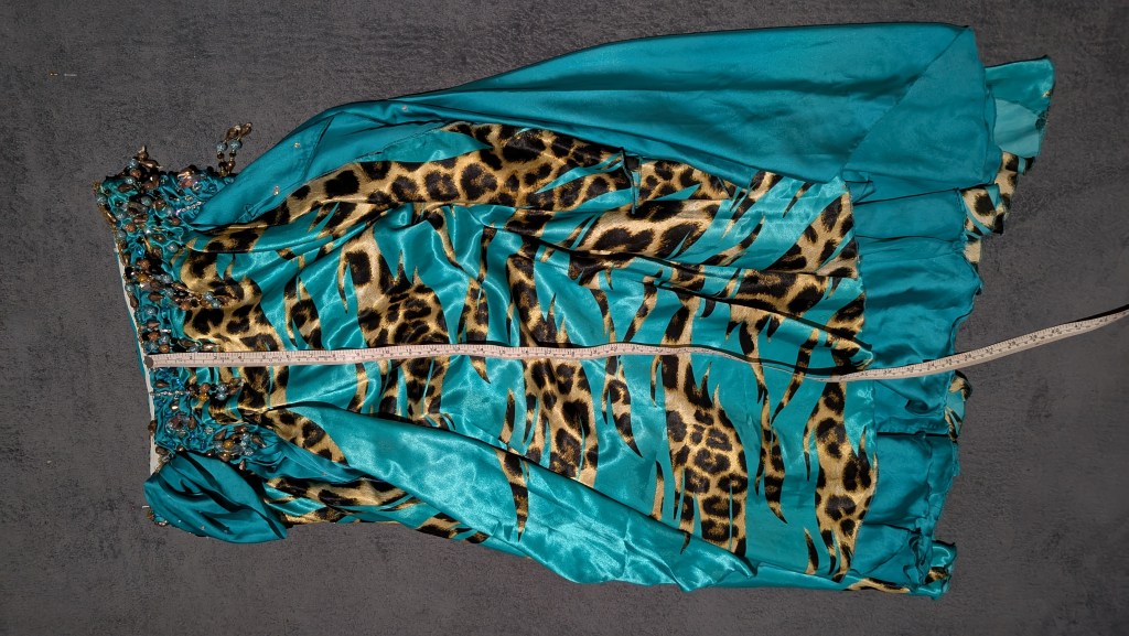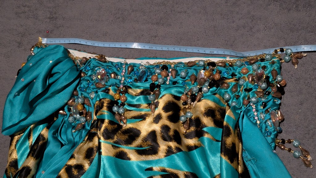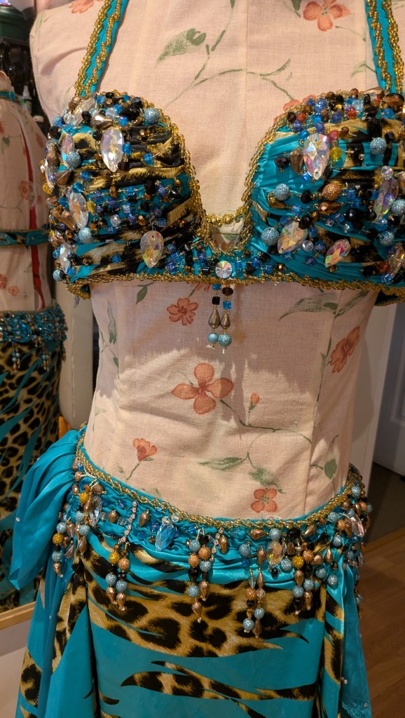 Light blue and leopard print satin skirt and bra, assymmetrical hem, with in-built lycra shorts