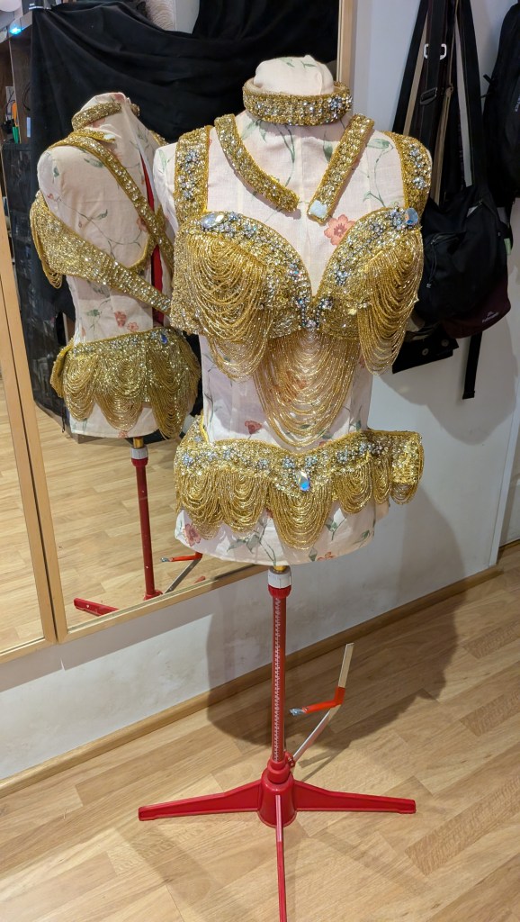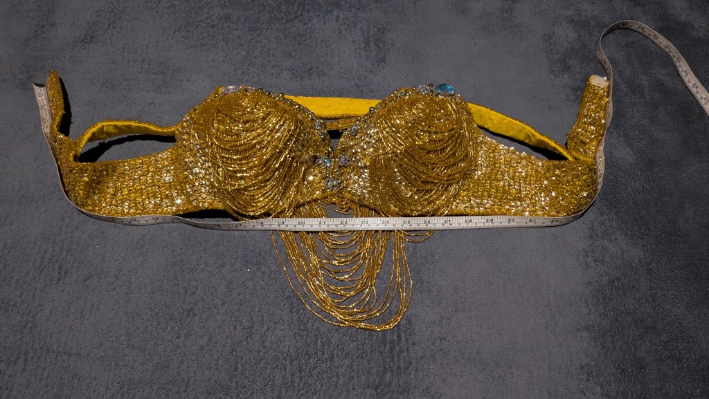 Bra and belt, two wrist bands, and head band.
