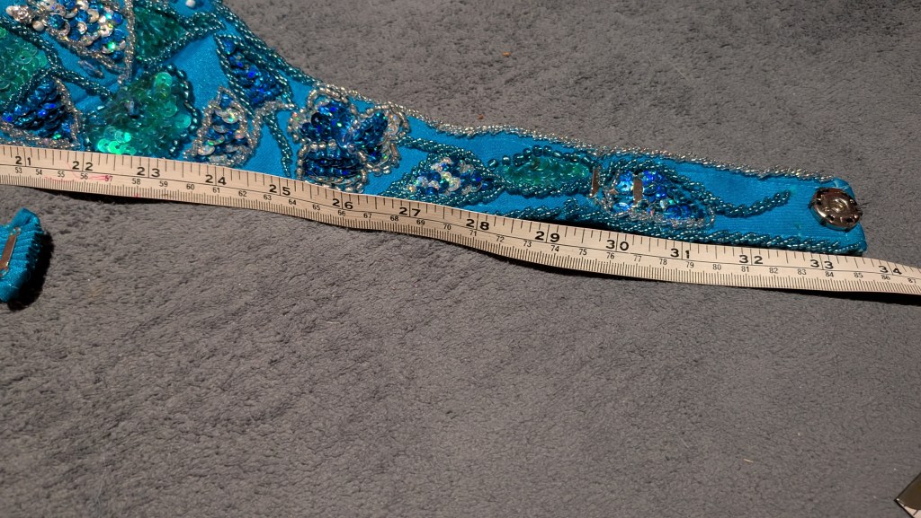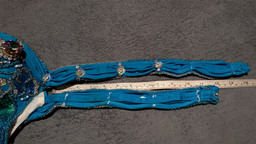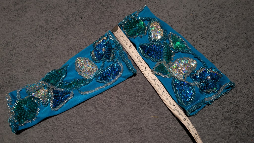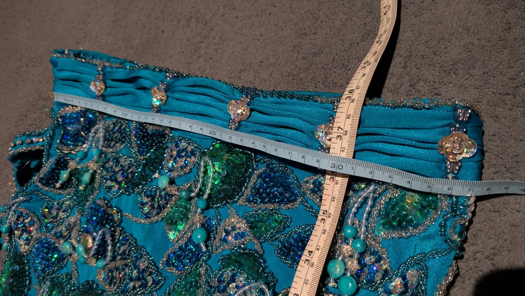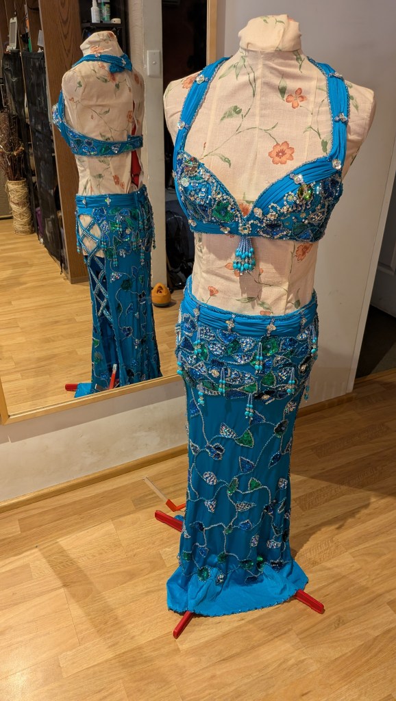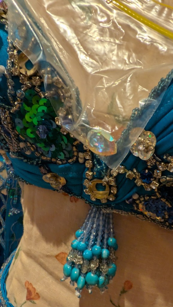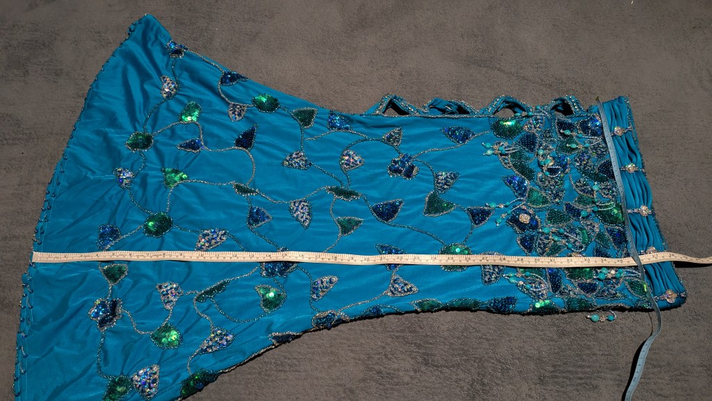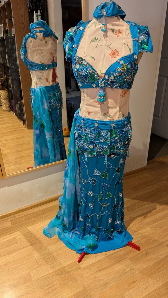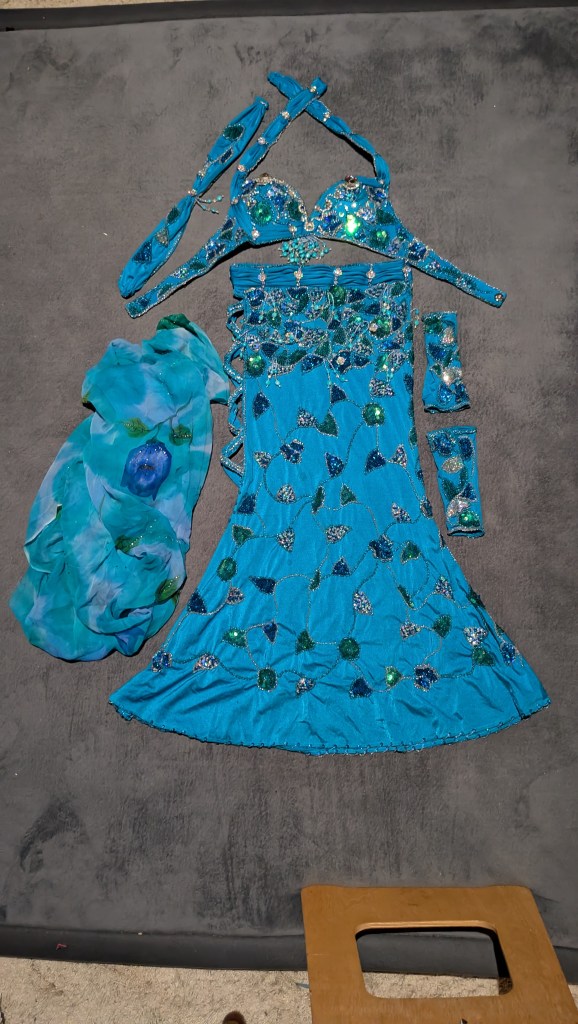 Turquoise lycra with silver, blue and green beading/sequins, side cut-out, and matching silk crepe fabric (can use to fill cut-out, entrance veil, etc)