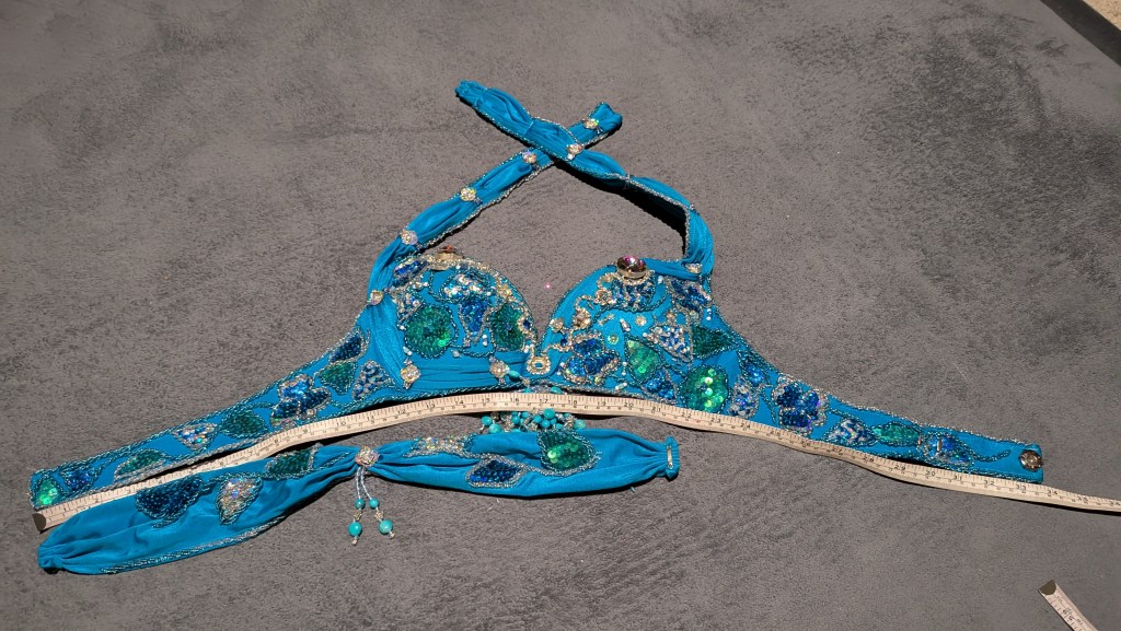 Skirt, bra, lower arm bands, head band, silk fabric piece (~2m), spare jewels.